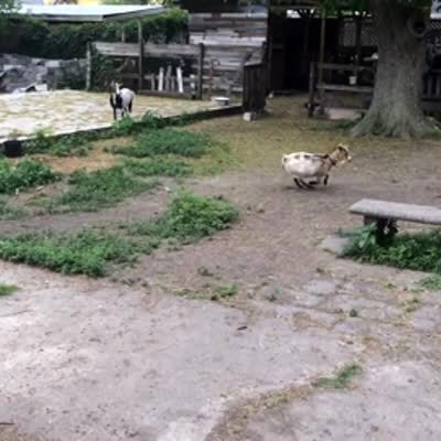 A goat chases a dog around the backyard and headbutts the dog in the butt as the dog plays fetch with a woman.