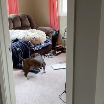 A young girl does the disappearing human trick on a dog in the living room. When the dog gets back to the room, it drops the toy and runs around and looks for her. It starts to bark and then finds her when she moves under the blanket. Disappearing Human Trick