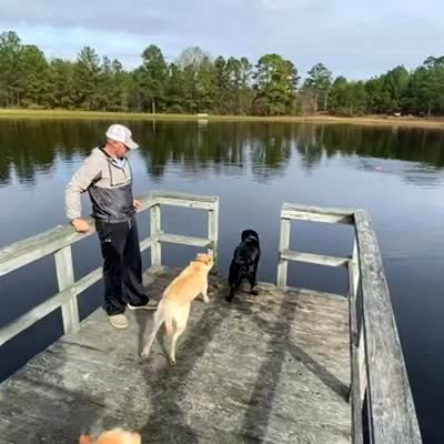 A man throws a toy off of a dock at a lake while a woman tells a black dog to move, then two yellow labrador retriever dogs and another dog run past him and knock him into the water.