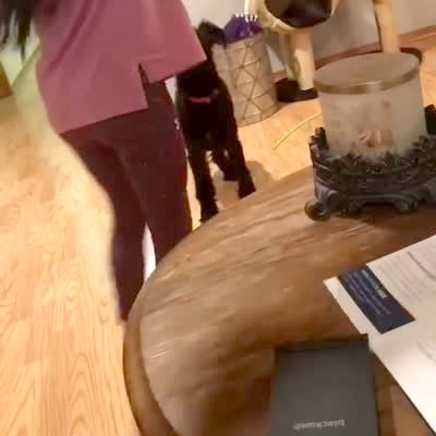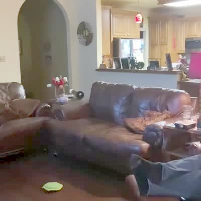 While inside the house a dog runs to fetch a ball. Her leash gets stuck on a television stand which knocks a large flatscreen television over, destroying it when it falls onto the floor.