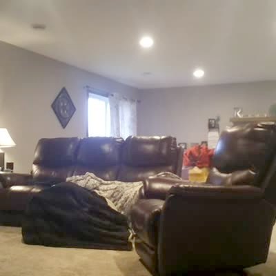 A man throws a toy for a German Shepherd dog and hides under a blanket in a living room, then the dog runs back and forth through the house with the toy in his mouth.