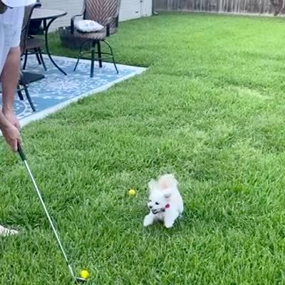 A senior man hits golf balls in a backyard and a tiny dog runs and gets them and brings them back.