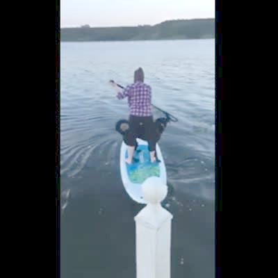 A woman rides a paddle board with a dog on it. A man throws a stick into the water and the dog jumps off of the board to fetch it and the woman falls off of the board and into the water.