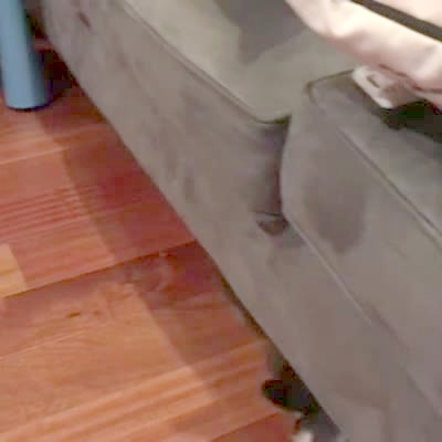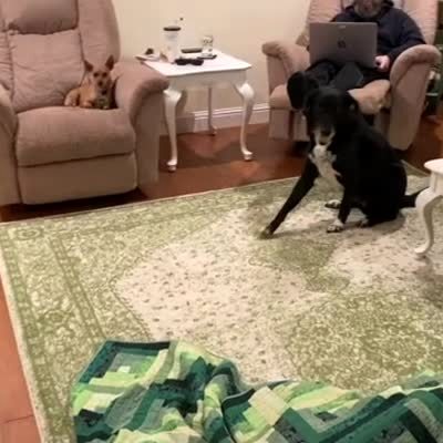 A woman does the disappearing human trick with her dog in the living room. The dog looks around the room for her, then barks when he smells her underneath the blanket.Disappearing Human Trick