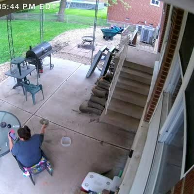 A woman throws a frisbee to her dog while she sits in a plastic chair on the patio and the chair breaks and she falls on the ground. Home security camera