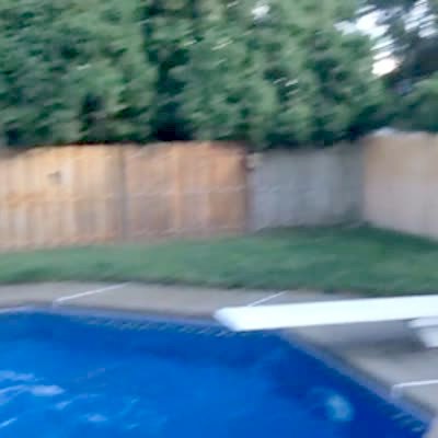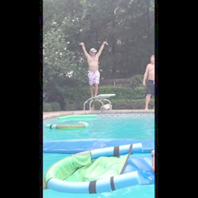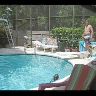 Dad jumps into pool and the diving board falls into pool. No tail.