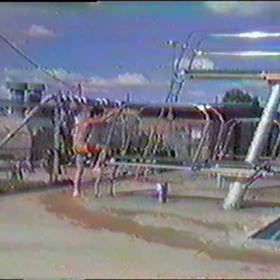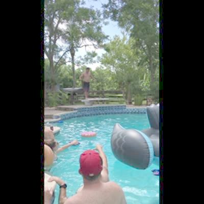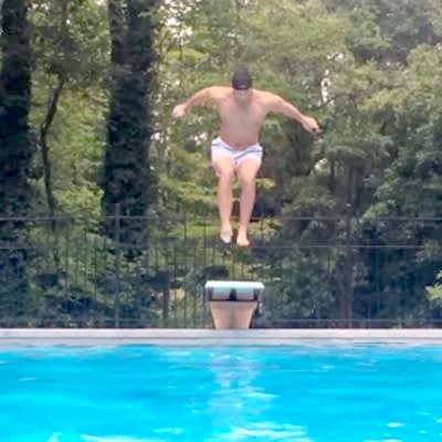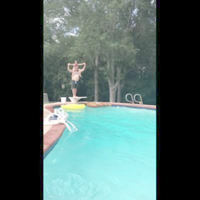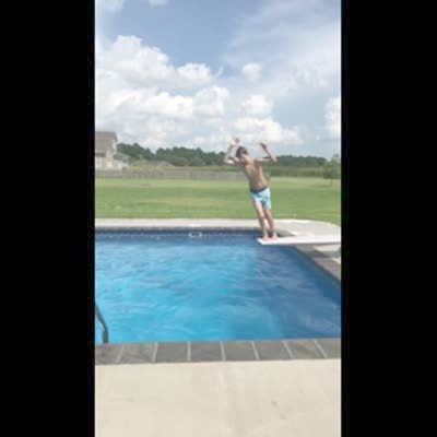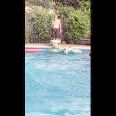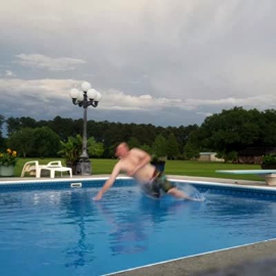 Man breaks diving board. (diving into swimming pool)