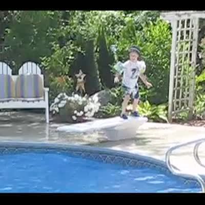 A little boy falls into a swimming pool after trying to jump in from a diving board. Short tail.