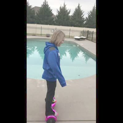 A young girl rides a hoverboard around a swimming pool. The girl steps off the board and it rolls towards the pool. The girl dives for the board but it falls in the water off camera.