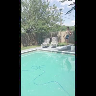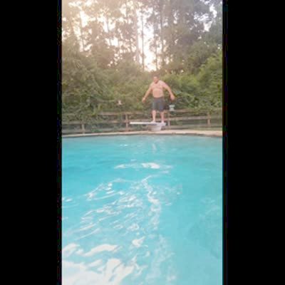 A man jumps on a diving board and it breaks and he falls into the pool. Music rights not cleared.