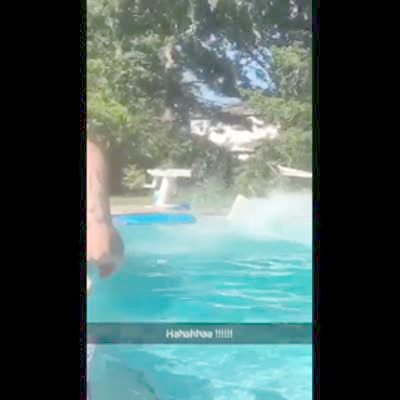 A diving board breaks when a man bounces on it and he falls in the swimming pool. Snapchat caption: Hahahhaa !!!!!!!