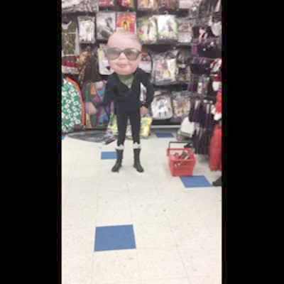 A teen girl wears a large baby face mask in a Halloween store and floss dances.
