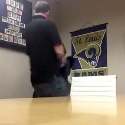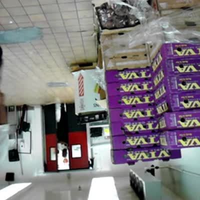 A man screams at a grocery store when his coworker scares him with a Halloween mask. Upside down.