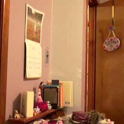 A dad dressed in a scary costume scares his daughter by hiding in her closet. She screams and runs away at 0:14.