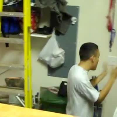 Man opens locker door, is surprised by man in monster mask & costume hiding inside. Practical joke, hidden camera, work, office, scare, Halloween,