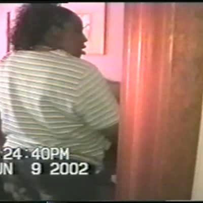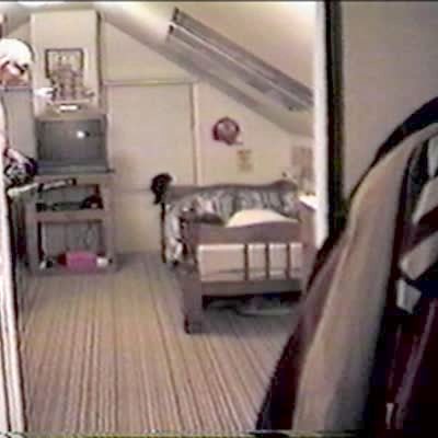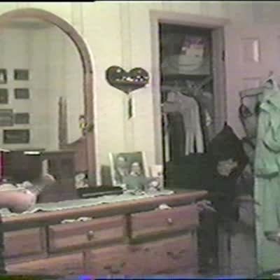 Man in mask hides in closet, scares man when he opens the door. Man who is scared falls backwards over bed. Practical joke, hidden camera, Halloween. Date on screen 2003.