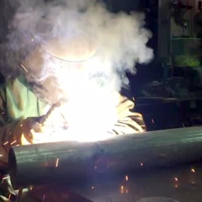 A person welds a metal pipe. They lift their welder's mask to reveal a Chewbacca mask.