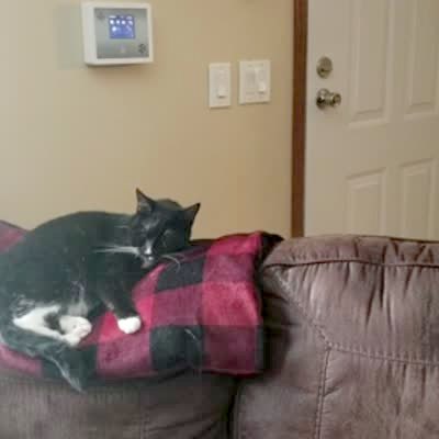 A teen boy wears a raccoon mask and scares a cat off of a couch.
