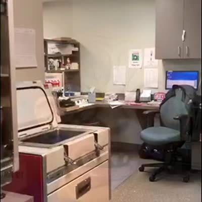 A man in a scary mask hides in an office and scares a woman when she walks past him.