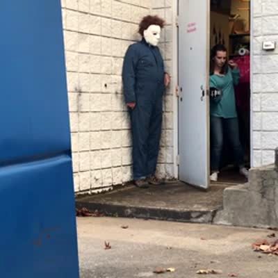 A man in a scary costume stands next to a door outside a building and scares a teen girl when she steps outside.