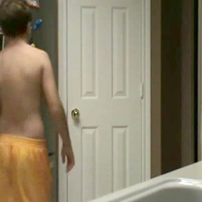 A man screams "oh my god" when his wife pulls back the shower curtain while wearing a terrifying-looking doll face mask.