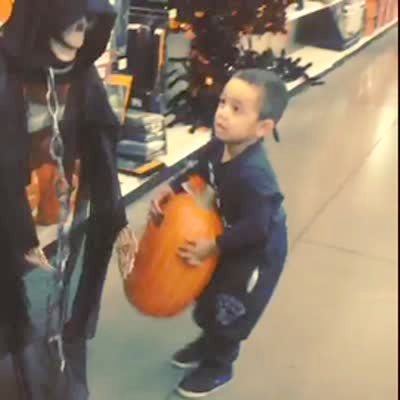 A woman scares a tot boy by shaking a Halloween decoration at him in a store. He runs and jumps into his father's arms, only to scream at the mask his father wears. Scare.