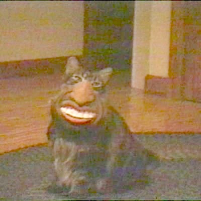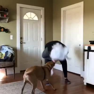 A woman in a senior man mask sings and dances in the living room and a dog jumps and bites the hair on the mask and pulls it off.