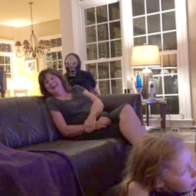 A woman wears a scary clown Halloween costume mask, and sneaks into her neighbor's house. A woman stands in the kitchen with her two young girl daughters. The masked woman screams and scares the girls and their mother, who screams and then laughs.