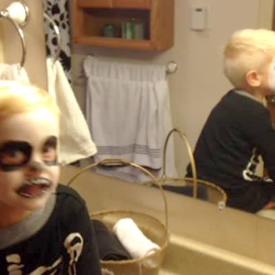 A tot boy with Halloween skeleton make-up painted on his face turns to see the make up in the bathroom mirror and frowns before he cries to the camera that he doesn't like it.