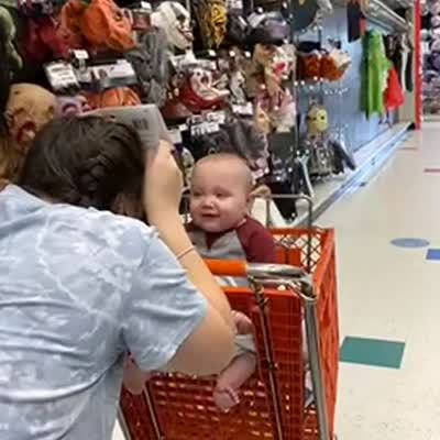 A mom holds a halloween mask over her face to scare a baby boy and he laughed in a store.