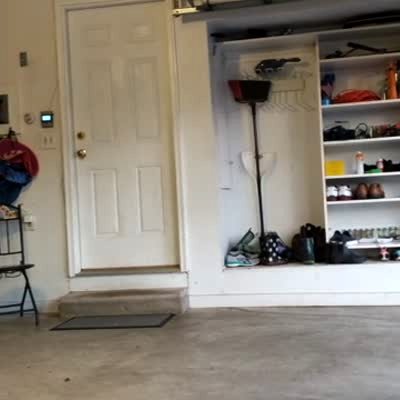 A man wears a halloween mask and hides in a garage and when his mother walks through it he growls and she screams.