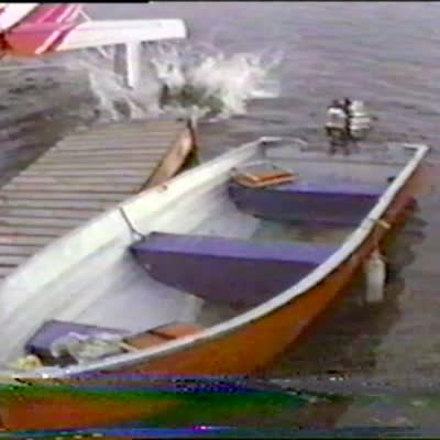 Dog chases remote control model airplane. Man goes to catch the plane before the dog gets it but he trips and falls. The glider then flies at the cameraman who yells "Goddammit" and falls over.