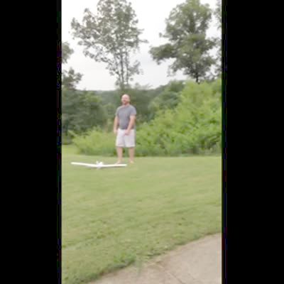 Boy flies remote control plane right into dad's arm. Good hit, no tail