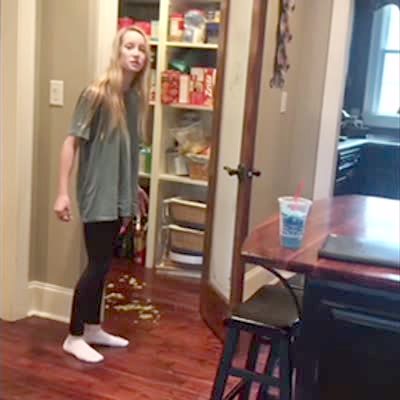 A man hides a taxidermied raccoon in the kitchen pantry to prank his teen daughter. The girl goes into the pantry to get her dad a snack and then gets scared and runs out of the pantry when she sees the raccoon.