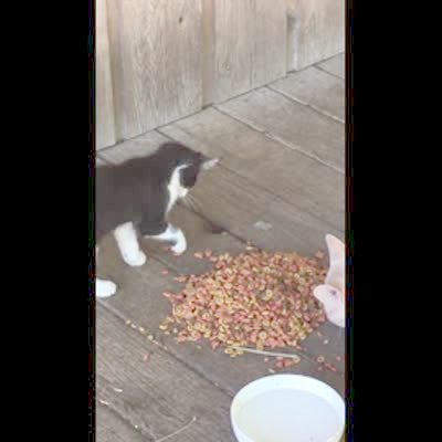 A raccoon sticks his hand out of a hole in the porch to grab pieces of cat food as three cats eat.