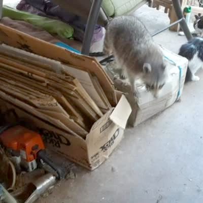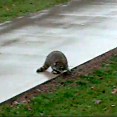 "Raccoon Acts Like a Goon" A raccoon walks up the front porch. A woman walks out and shoos it away. The raccoon comes back and chases the woman inside.