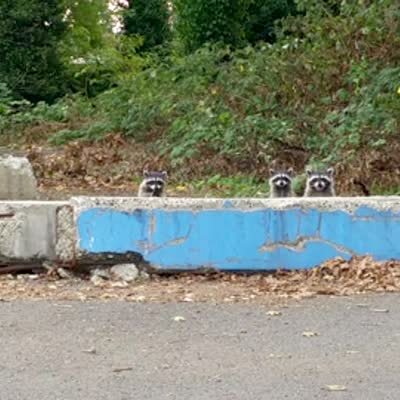 Several raccoons pop up from behind a cement wall outdoors one at a time in different places, resembling a whack-a-mole game.