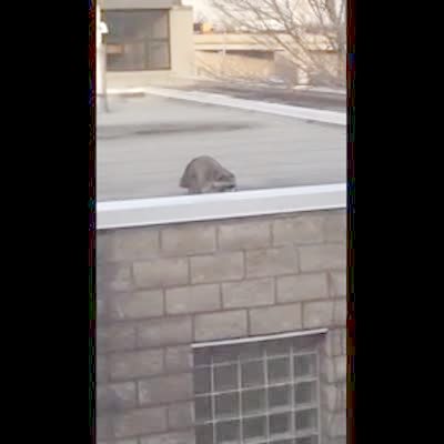 A raccoon walks around a yard of a house and then climbs up to an open window, and a family that watches him freaks out as a man off screen races to scare him off.