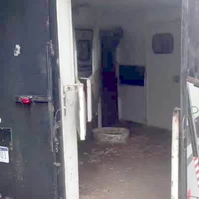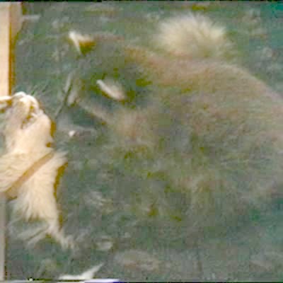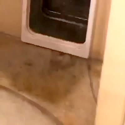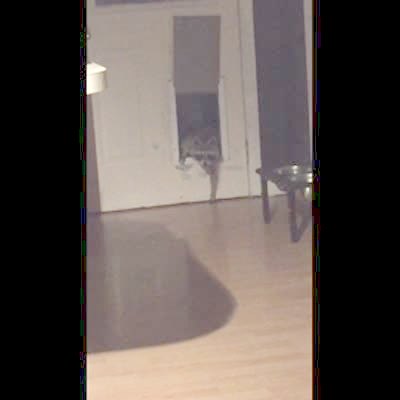 A cat shoots through a pet door. An instant later, a raccoon comes out. Security camera footage.