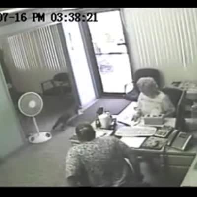 A raccoon falls through a ceiling and runs around a office space. Two women stand up and run out of the office as the raccoon runs all over the place. The raccoon eventually finds the door and runs outside.