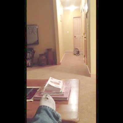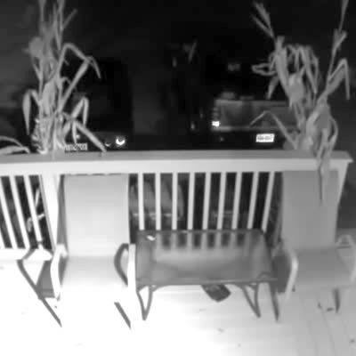 A rabbit runs past a man while he smokes a cigarette outside, and he screams loudly and jumps, then claims that a big-ass raccoon ran at him. His teen boy son comes out and asks if it was the rabbit, and the father says "no." Security footage.