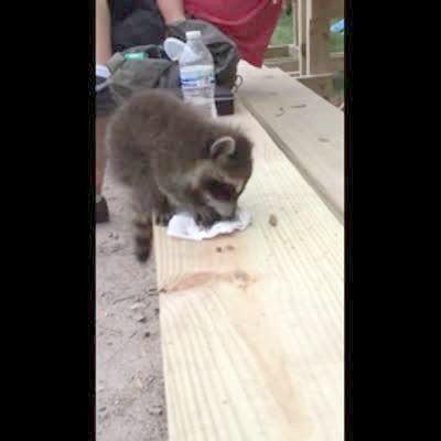 A baby raccoon eats food on a bench and falls off of the bench.