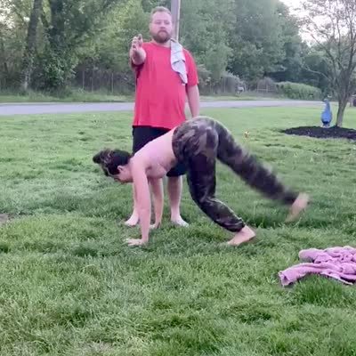 A man helps a woman do a handstand in the front yard. She sees a raccoon then swears, and runs into the house.