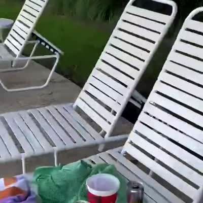 A man on a deck pans the camera across a body of water to a raccoon that rests and relaxes in a bed.
