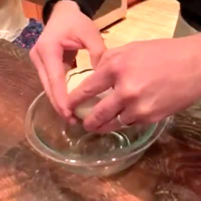 A man cracks a large egg into a bowl and finds another egg inside of it. He then cracks the second egg into the bowl as well. A tot girl watches and guesses there will be a raccoon inside the egg.