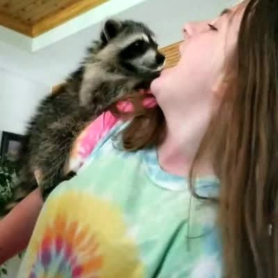 A raccoon sits on a teen girl's shoulder and looks into the mouth girl's mouth. The raccoon sticks its mouth and paws in the girl's mouth.