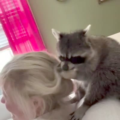 A raccoon brushes a woman's hair with its paws in a living room.