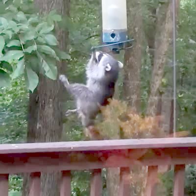 A raccoon tries to jump from a bush to a bird feeder and misses, falling.