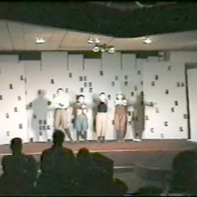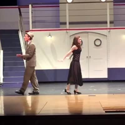 Girl doing cartwheels during musical stage performance kicks boy in face. Performance of Gypsy.