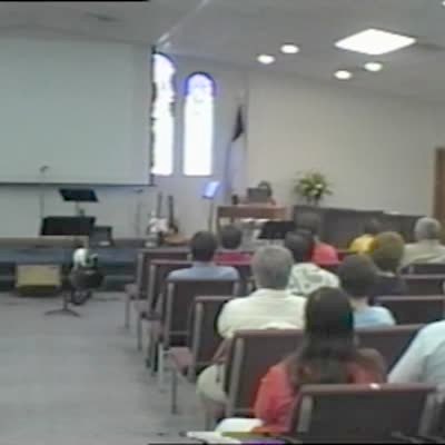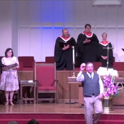 A man falls as he walks down the steps and says, "Happy Mother's Day" and people laugh in the church.